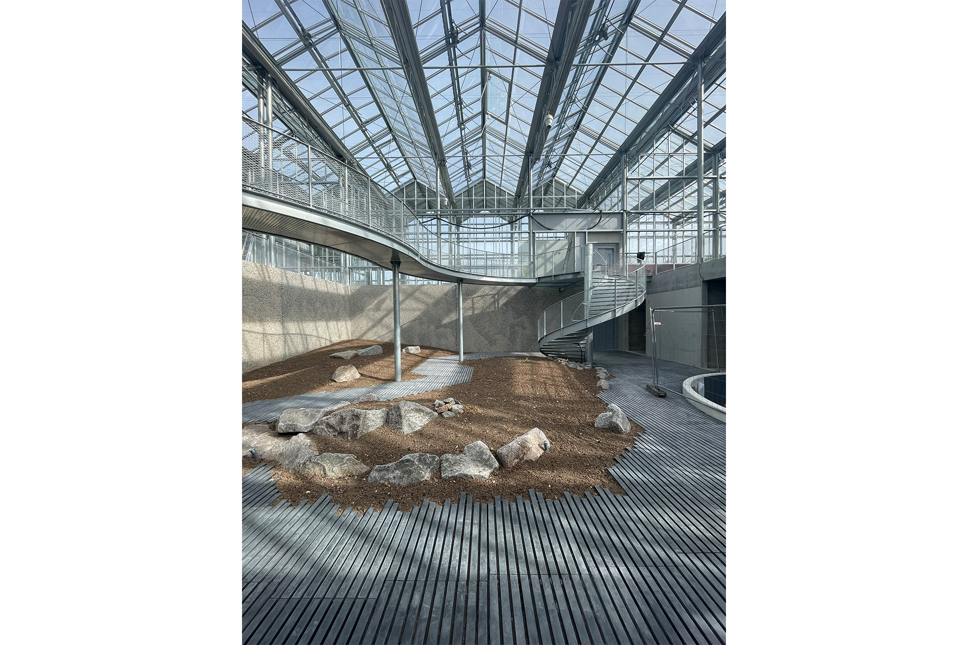 Taking advantage of these two superimposed levels, it was possible to create in the volume of the greenhouses a double-height sequence – 12 meters – making it possible to install high species, to enrich the installations and to create a greater richness of the visit route – for example with the footbridge overhanging the space below and passing close to the high plantations. This choice also allows us to offer accessibility of all sequences of the visit to all publics (PMR).