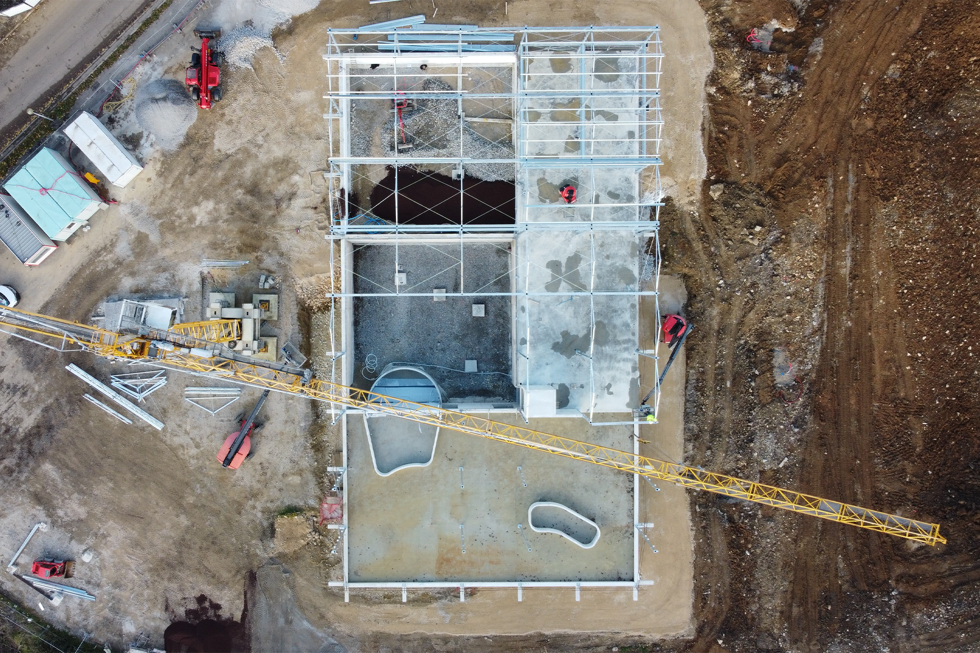 In view of the topography of the site and the existing plantations, we have chosen to locate a little west of the proposed right-of-way. This choice allows us to preserve the small wood and to embed the building in the existing slope while requalifying the degraded soils of the old parking lot. This choice also makes it possible to design a spatial organization on two levels, by superimposing cold and warm programs. It also makes it possible to obtain a more compact footprint of 50% of approximately 1000 m2 instead of the 1500 m2 planned.
